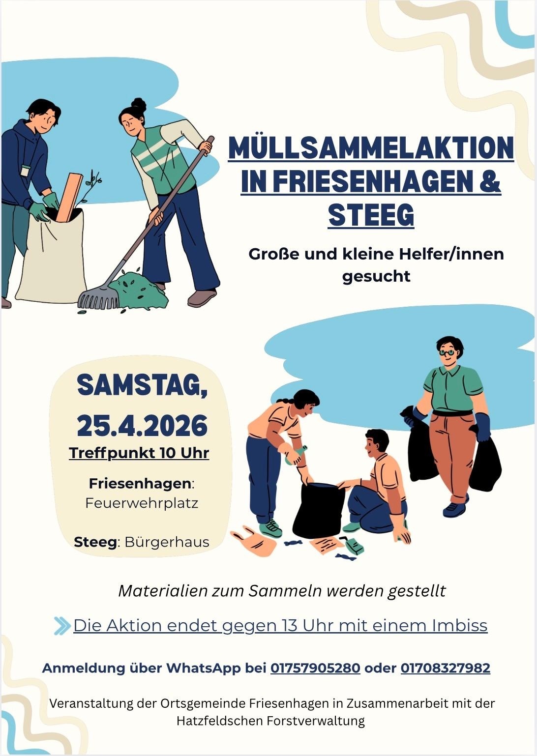 Die Ortsgemeinde Friesenhagen lädt alle Einwohner herzlich ein, sich an unserer gemeinsamen Müllsammelaktion zu beteiligen. Gemeinsam möchten wir unsere Gemeinde von achtlos entsorgtem Müll befreien und so einen aktiven Beitrag zum Umweltschutz leisten. Gesammelt wird überwiegend entlang der Straßen aus Friesenhagen und Steeg heraus sowie entlang von stark frequentierten Waldwegen. Die Aktion findet in Zusammenarbeit […]